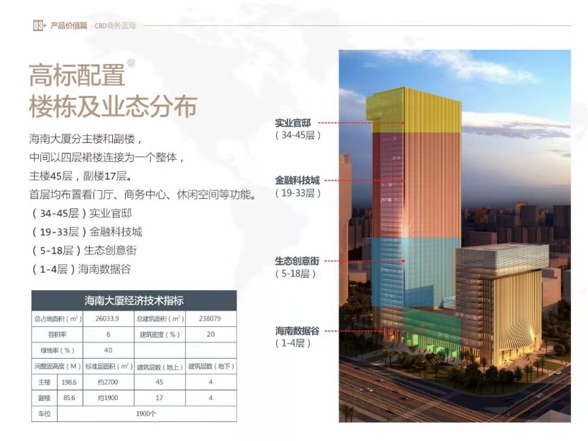 项目定位于国际旅游岛CBD ***超***写字楼 。楼栋及业态分布 项目分主楼和副楼,中间以四层裙房连接为一个整体。业态上, 1-4层为高端商业,5层以上为***智能***办公。